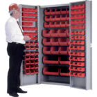 All-welded heavy-duty 16-gauge, combination bin/shelf cabinet | 4″” deep hinged doors | Unique padlock hasp helps prevent access with bolt cutters | Powder coated Kleton grey finish | Padlock sold separately ; 118 BIN CABINETS | Incorporates louvered bin hanging panels welded to the cabinet’s back and doors; ; | Bins supplied: 42x 5 3/8″” W x 4 1/8″” D x 3″” H; 42x 7 3/8″” W x 4 1/8″” D x 3″” H; 18x 10 7/8″” W x 5 1/2″” D x 5″” H; 12x 14 3/4″” W x 8 1/4″” D x 7″” H; 4x 14 3/4″” W x 16 1/2″” D x 7″” H | CABINET & BIN COMBINATION | Cabinet and plastic bins | | | | | | | | |