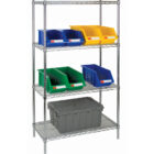 Heavy-gauge shelves with open wire design minimize dust, improve air circulation and provide greater visibility of stored items | Post’s circular grooves combined with tapered plastic split sleeves allow for assembly in minutes with no special tools | Shelf ribs run front to back allowing items to slide on and off shelves smoothly | Shelves can be adjusted at precise 1″” intervals | Posts are double grooved every 8″” and numbered for easy adjustment | Adjustable feet compensate for surface irregularities | Stationary unit’s total capacity should not exceed 2000-lb. | Assembly required | NSF certified | | | | | | | | |