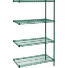 Green epoxy wire shelving is ideal for use in wet environments | Superior rust resistance | Designed to minimize dust, improve air circulation and provide greater visibility of stored items | Post’s circular grooves combined with tapered plastic sleeves allow for assembly in minutes with no special tools | Shelf ribs run front to back allowing items to slide on and off shelves smoothly | Shelves can be adjusted at precise 1″” intervals | Posts are double grooved every 8″” and numbered for easy adjustment | Adjustable feet compensate for surface irregularities | Stationary unit’s total capacity should not exceed 2000 lbs. | Ideal for use in wet environments | NSF certified | | | | | | |