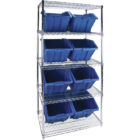 Adjustable chromate wire shelves | Wire shelving resists corrosion and provides greater visibility to stored parts | Wire shelves prevent build up of dust and dirt | Bins are unaffected by oil, alkaline and most acids | Ideal in production or for parts storage | Assembly required | Stationary unit’s total capacity should not exceed 2000-lb. | NSF certified | | | | | | | | | |