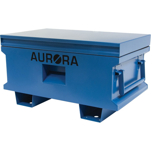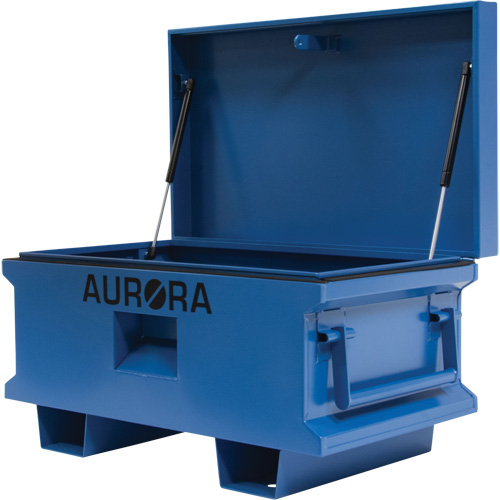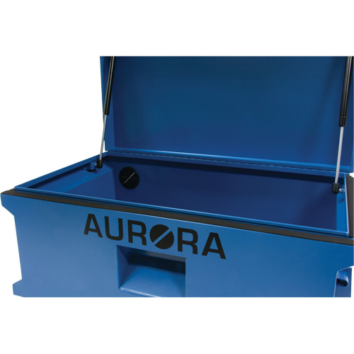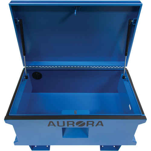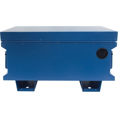 Two gas struts to assist with lid opening | Piano hinge closes lid securely to keep the elements out | Rubber grommet to allow electrical cord pass through | Heavy-duty flip-up side handles | Moveable by 12-gauge forklift rails | Recessed hasp to securely lock with padlock (not included) | Finished with UV-resistant powder coat | | | | | | | | | | |