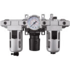 Assembly of all three individual components | Components are attached in series using spacers and piping adapters, which make the individual components easily removable and mountable without disturbing the pipe line | Comes complete with wall mounting bracket | Regulators are used to maintain a steady outlet pressure, unaffected by variations or fluctuations in the inlet pressure | Filter used to separate dust, dirt, moisture and other contaminants from compressed air | Filter features press-type manual drain with nighttime drain feature, which automatically drains off the bowl once the compressed air supply to the filter is switched off | Filter has sintered bronze, 40-micron filtering element | Lubricator used to feed lubricants to pneumatic equipment and maintain a constant oil-to-air density over a wide range of flow | Fog/Micro Mist type lubricator, up to 50′ pipe runs | Air filter, regulator and lubricator come with NPT threads and gauge | | | | | | | |