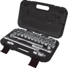 (24) Standard sockets – 3/8"", 7/16"", 1/2"", 9/16"", 5/8"", 11/16"", 3/4"", 13/16"", 7/8"", 15/16"", 1"", 9 mm, 10 mm, 11 mm, 12 mm, 13 mm, 14 mm, 15 mm, 16 mm, 17 mm, 18 mm, 19 mm, 20 mm, 21 mm; (1) Quick-release ratchet; (1) 5"" Extension; (1) 10"" Extension; (1) Universal Joint; (1) 3/8"" Female x 1/2"" Male drive adapter